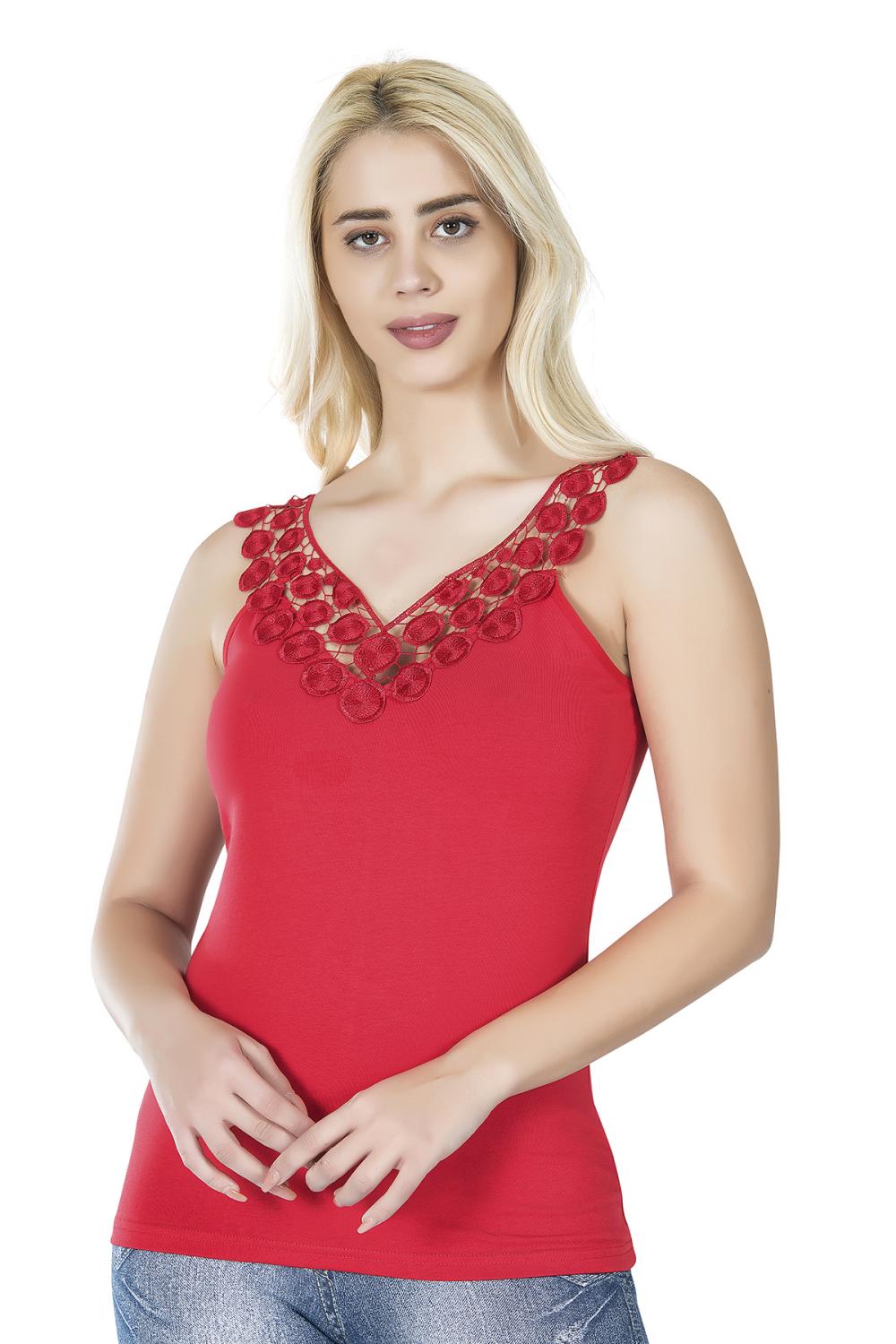 Güpür kabartma dantel detaylı tasarımıyla şık bir görünüm kazandıran sıfır kol kadın tişört