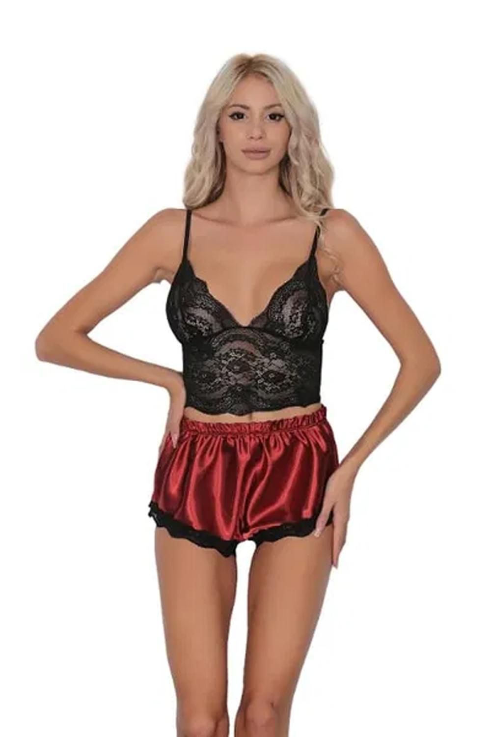 Kadın Siyah Dantel Büstiyerli Fantezi Şort Takım - 2114