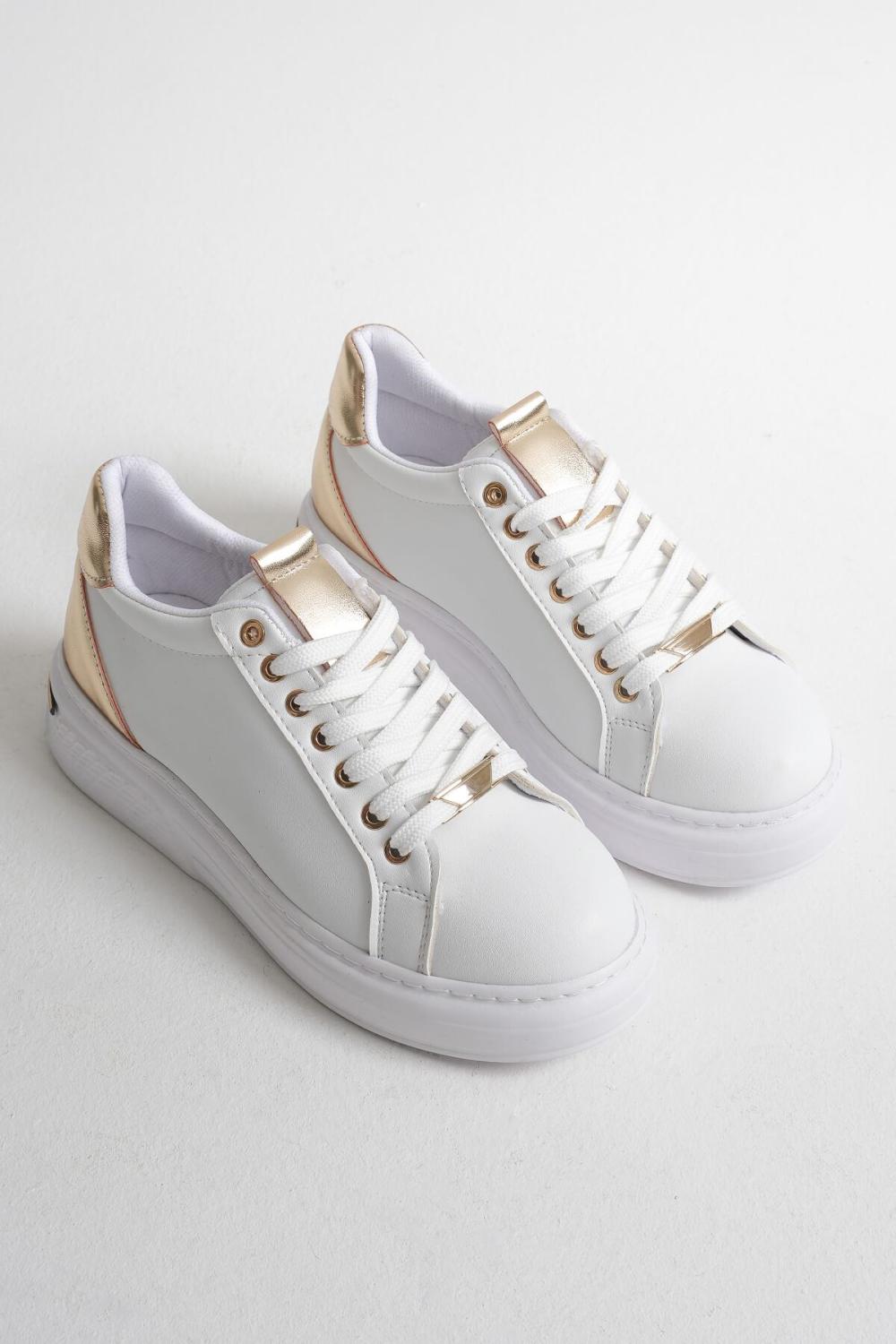 Beyazın saf ışıltısı, altın ayna garnisinin lüks dokunuşuyla birleşti: ilk bakışta “temiz ve premium”, yürürken “iddialı ve çekici”. Sabah ofis stilinden akşam buluşmalarına kadar her ana uyumlanır; basic kombinleri tek hamlede sofistike seviyeye taşır. Ayağı nazikçe saran formu gün boyu dengeli bir konfor verir; ritmini bozmadan şehri yönetirsin.